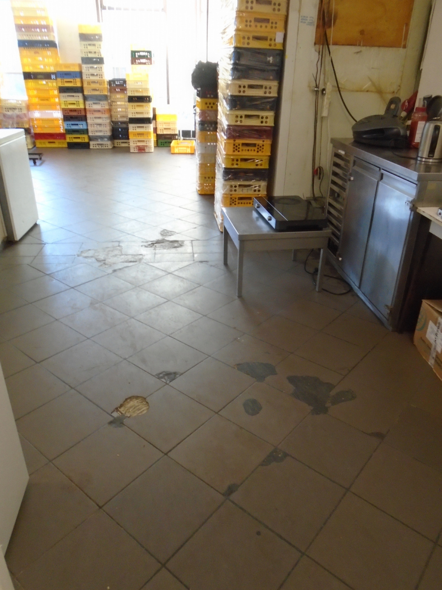 Kontrolou na místě samém bylo zjištěno, že v provozovně není prováděn pravidelný a řádný úklid. Povrchy technologického vybavení v přípravnách byly znečištěny mastnotou, zbytky pokrmů a špínou tmavé barvy, a to zejména v hůře přístupných místech jako jsou boční a zadní stěny jednotlivých zařízení (pracovní stoly, sporák, hnětač). Povrchy úložných polic, elektrických zásuvek a vypínačů, osvětlovacích těles byly znečištěny mastnotou, která vytvářena žlutohnědý povlak. Povrch podlah v prostorách výrobny byl též znečištěn mastnotou a zbytky potravin, PVC krytina byla potrhaná a na podlaze byla místy až na beton poškozená dlažba. V rozích místností a po obvodu zdí byl na podlaze zjištěn i myší trus.
