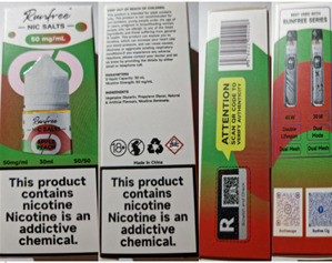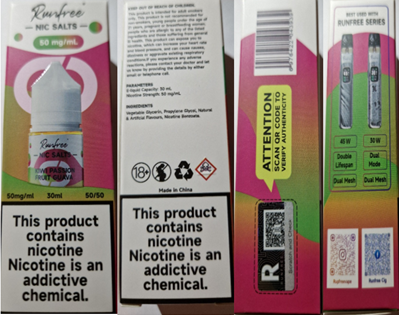 Home Nebezpečné výrobky Nebezpečný výrobek – náhradní náplň do elektronických cigaret zn. Runfree, NIC SALTS – 2 příchutě