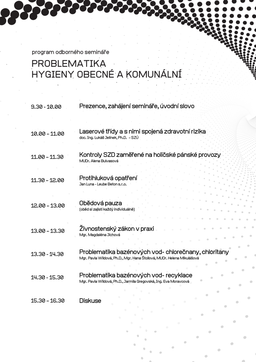 V rámci programu se účastníci seznámili s problematikou laserů v provozovnách provádějících činnosti epidemiologicky závažné nebo informacemi z kontrol realizovaných pracovníky hygienické služby v pánských holičstvích se zaměřením na prevenci předcházení infekčních onemocnění. Další přednášky se zabývaly nastíněním možných protihlukových opatření v okolí komunikací a tělesech drah v podobě protihlukových stěn, a to jak trvalých, tak mobilních. V odpoledních hodinách následovalo právní okénko nad novelou živnostenského zákona a jeho dopady na práci hygieniků. Posledním tématem pak byla problematika bazénových vod, a to jak z pohledu derivátů desinfekce, tak v souvislosti s výsledky cíleného úkolu hlavní hygieničky v otázce recyklace pracích vod z pískových filtrů.